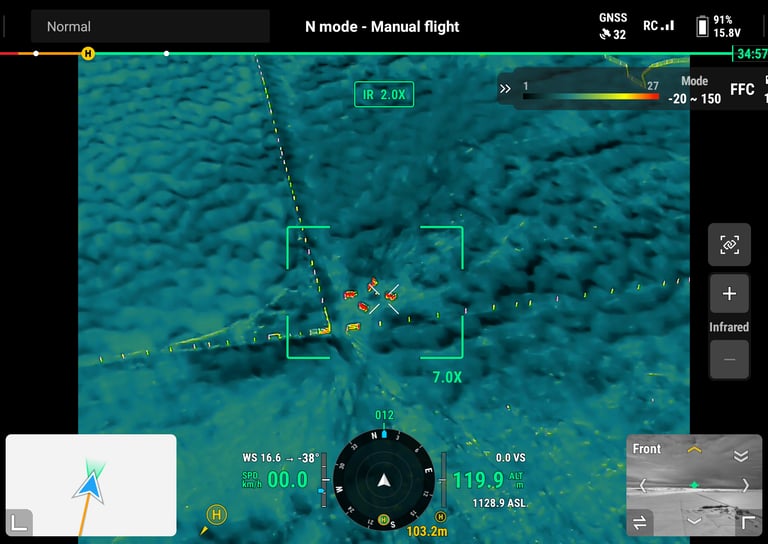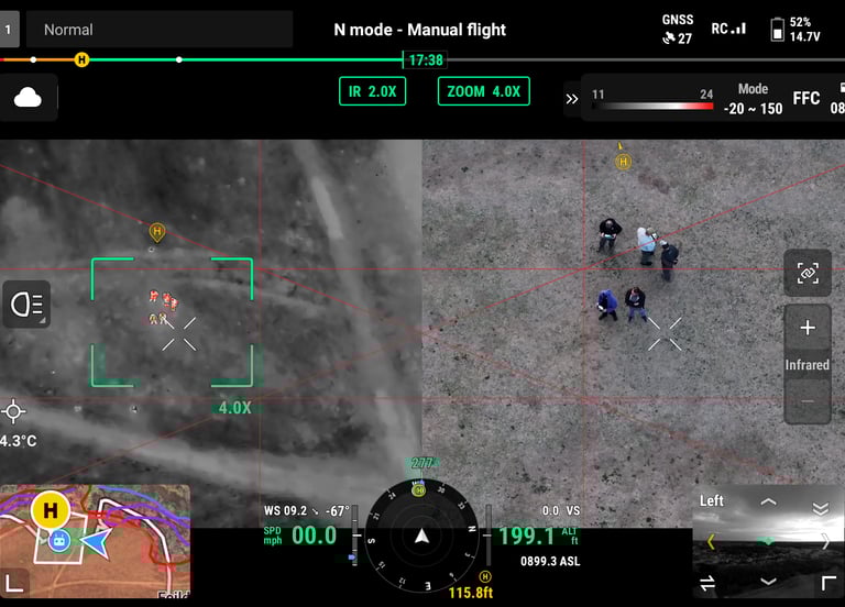 We fly the DJI Matrice 4T, a powerful platform equipped with high-resolution thermal and visual imaging capabilities—ideal for critical missions such as search and rescue, heat loss detection, wildlife spotting, and environmental monitoring.